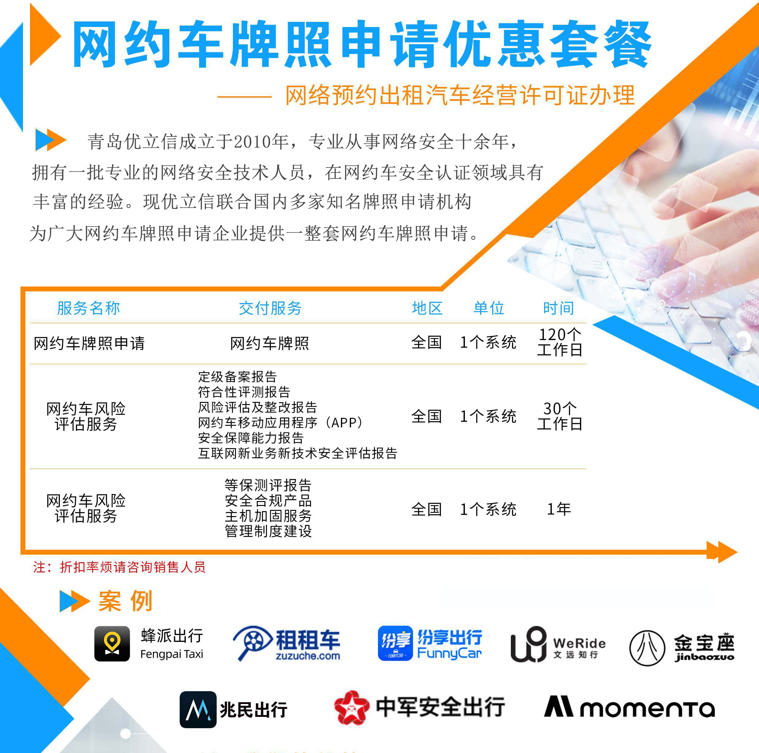 现优立信信息技术联合国内多家知名牌照申请机构,为广大申请网约车牌照企业提供一整套网约车牌照申请优惠套餐。